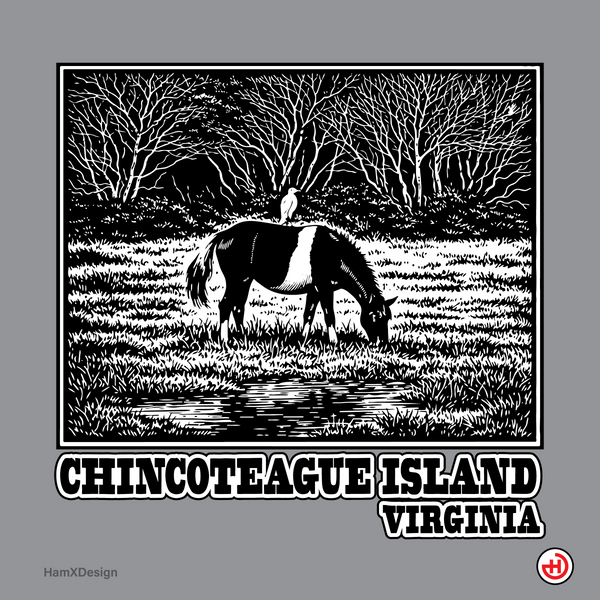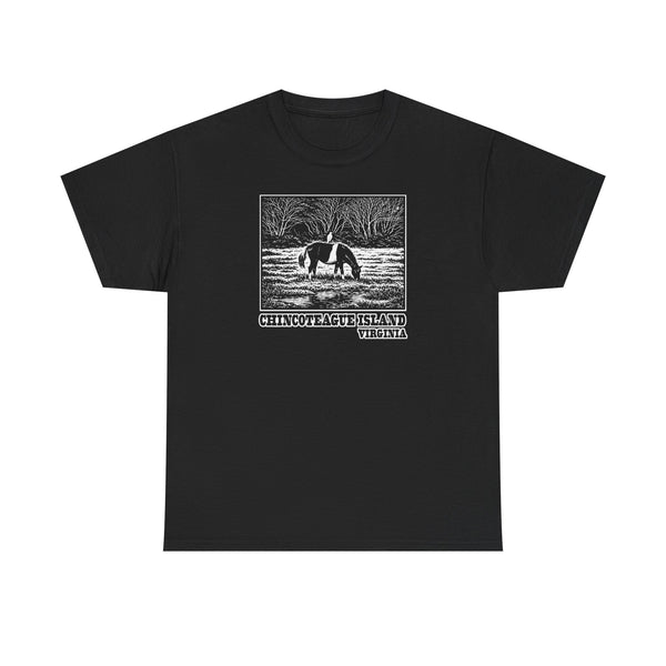 Settle into the quiet of the marsh with this classic tee that speaks to coastal rhythms. A simple, woodcut-style pony grazing by marsh grass sits inside a framed square — an image that feels like a postcard from an island sunrise. The shirt’s relaxed cut and soft, spun-cotton surface let the artwork sit clean and bold, while the muted black-and-white print keeps the vibe understated and honest. Wear it on morning walks, slow ferry rides, or when you’re sharing shoreline stories around a fire. It’s designed to age with you: the fabric holds shape, the collar stays true, and the print remains crisp so the memory of that place keeps coming through every time you pull it on.