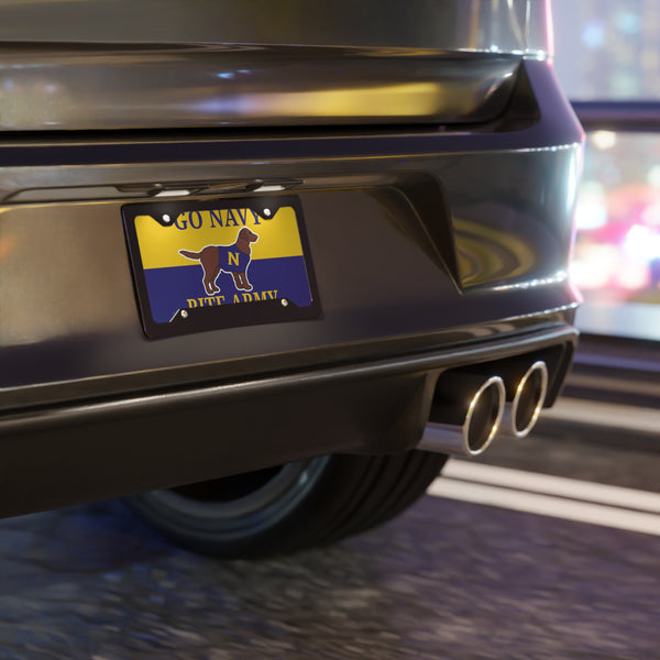 This unique Vanity Plate features the phrase 'Go Navy Bite Army Dog' in vibrant colors, perfect for those with a patriotic and military-themed style. It is a great addition to any car or truck, adding a touch of personality and pride. Ideal for Navy supporters, military families, and anyone who loves a bold and eye-catching design. Perfect for Memorial Day, Veterans Day, Fourth of July, or any military-related event.