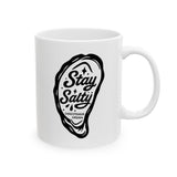 A ceramic mug with a glossy finish featuring a design that says 'Stay Salty' and an oyster. This mug gives off a beachy, relaxed vibe perfect for those who enjoy coastal living or summer vibes. Ideal for beach lovers, seafood enthusiasts, or anyone who appreciates a laid-back lifestyle. Great for gifting on birthdays, beach vacations, or to add a touch of relaxation to daily coffee or tea rituals.