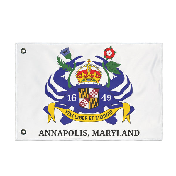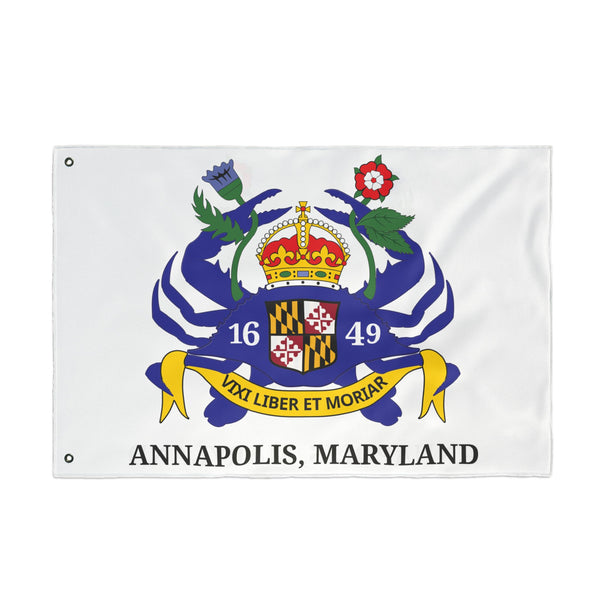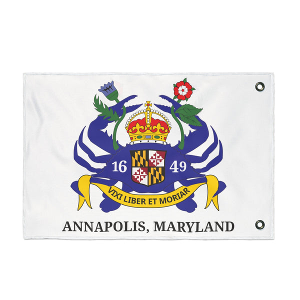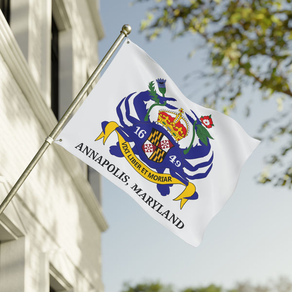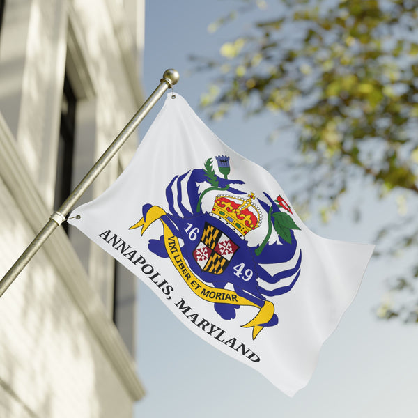 A bold, double-sided flag reimagining the classic Annapolis, Maryland banner. Crisp lines and vibrant inks bring my personal redesign to life on both faces, so your display reads true from either direction. The lightweight polyester fabric moves easily on a breeze yet resists stretching and shrinking, keeping the colors and emblem sharp through seasons of use. Durable metal grommets make hanging straightforward on a pole, fence, or porch. Hang it on civic holidays, during local regattas, or whenever you want to show city pride with a fresh, hand-designed statement.